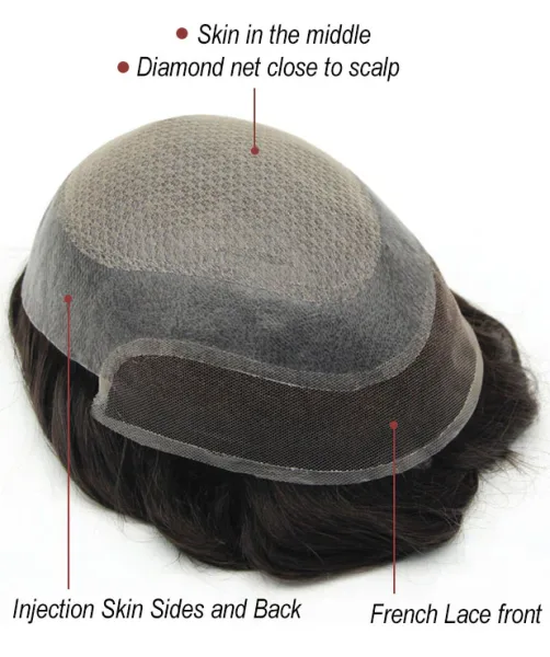 The French lace front creates a realistic, undetectable hairline, blending seamlessly with the scalp. This combination of diamond lace strength and French lace realism delivers a premium hybrid hairpiece suitable for medium to high hair density.